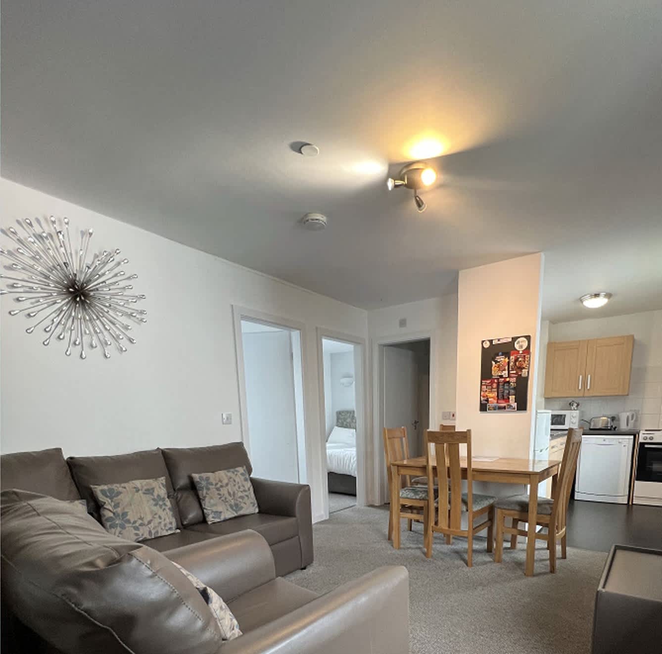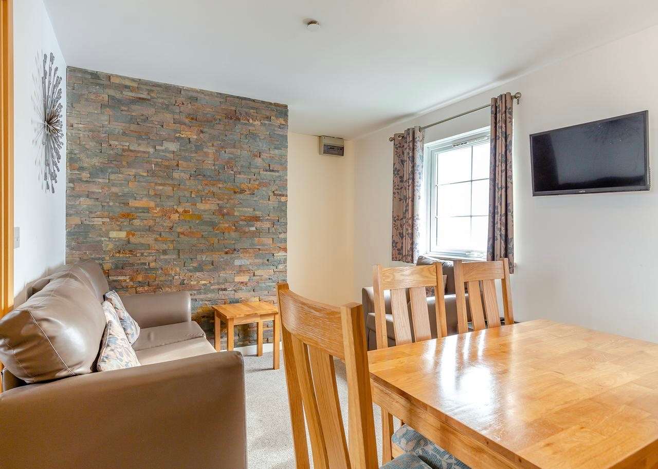 A bright two-bedroom self-catering apartment with double and twin bedrooms, and linen included. The airy living room has a comfortable sofa, flat-screen TV and dining area. The kitchen is well-equipped with appliances including an electric hob/oven, fridge, dishwasher and microwave, and there is a toaster and kettle too as well as plates, cutlery and basic cookware. There is a clean, tiled bathroom with an electric shower.