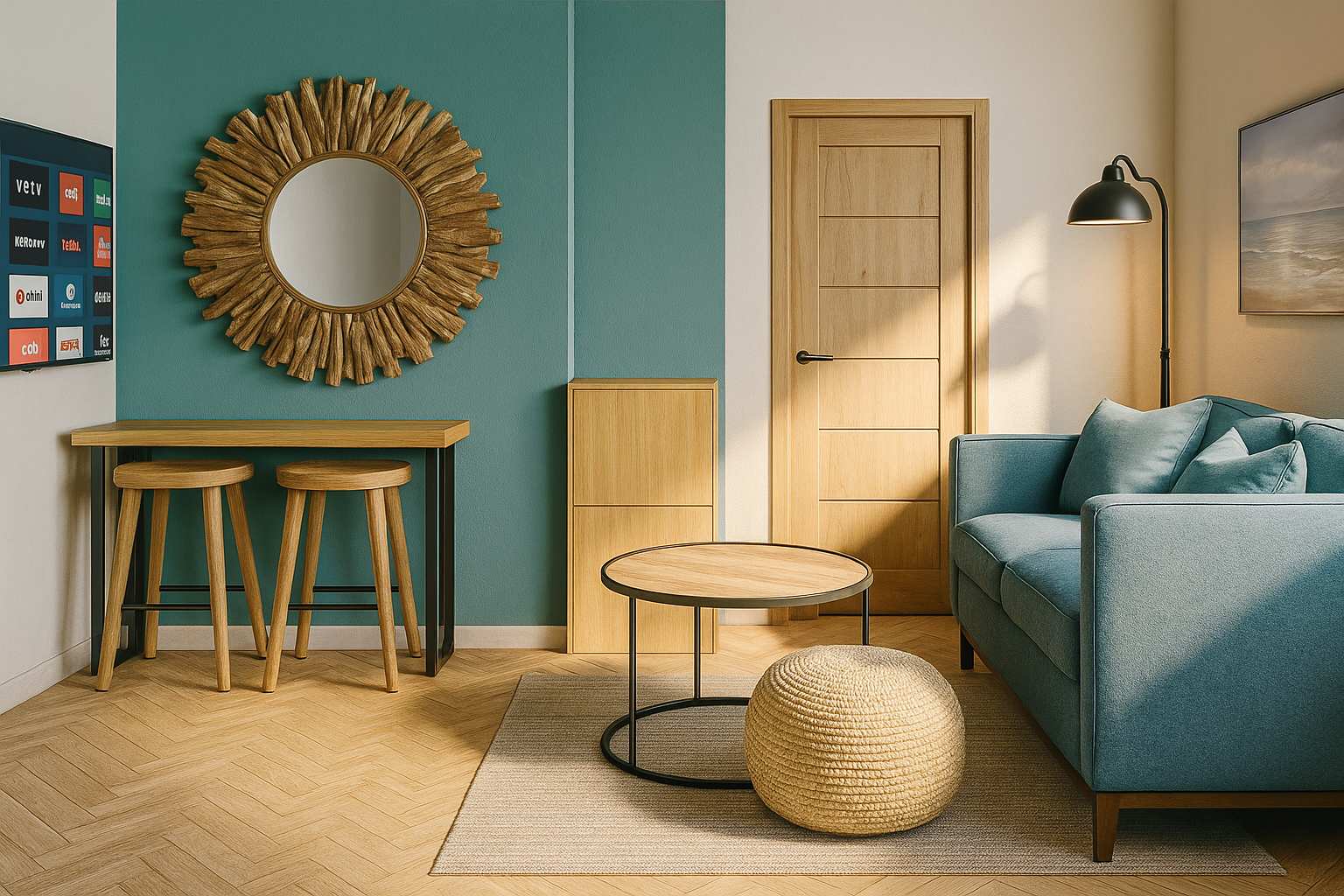 • Modern Kitchenette: Compact area with sink, fridge, toaster, kettle and microwave.