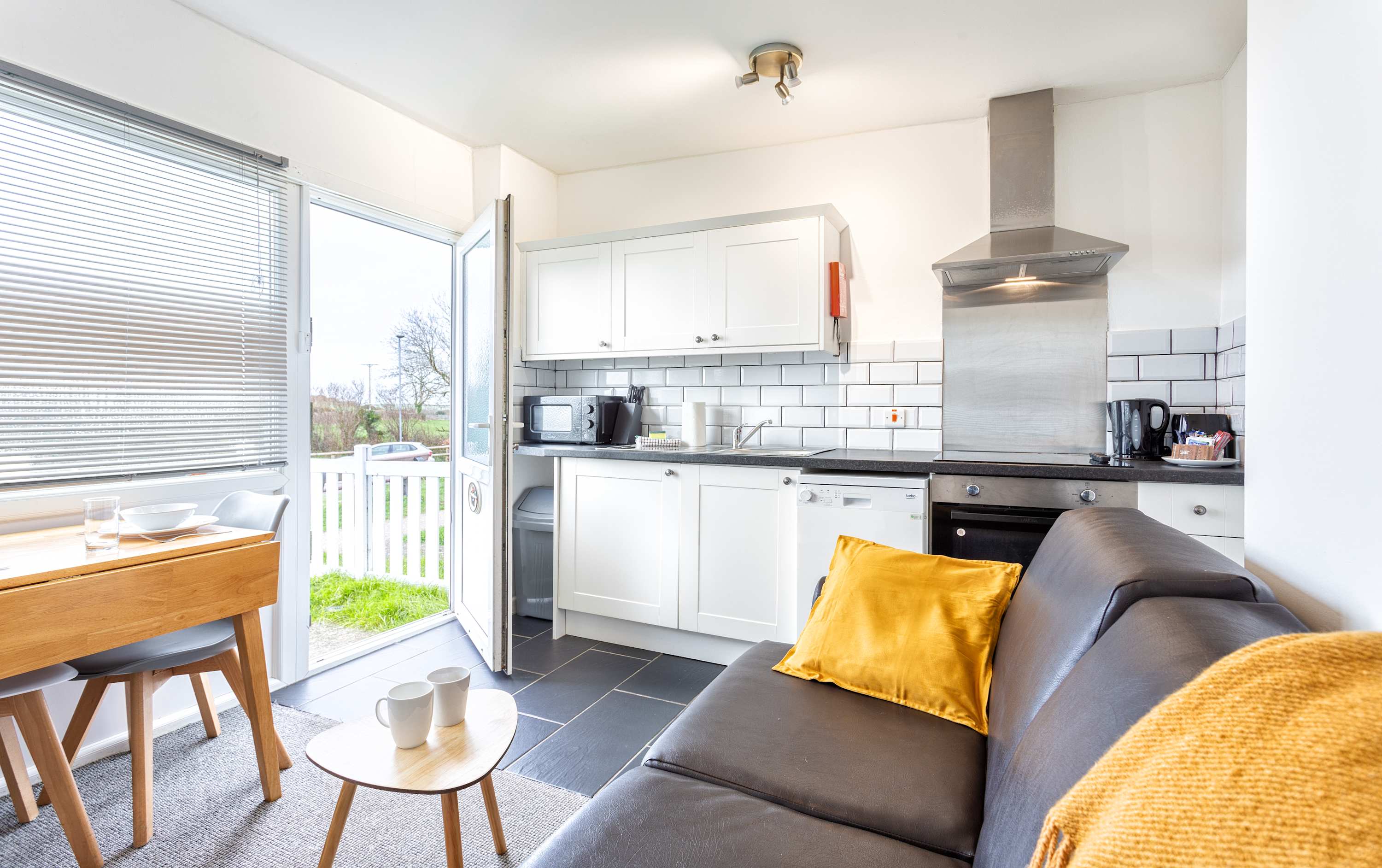 This thoughtfully designed one-bedroom apartment features a stylish living space with a cosy seating area, a sleek kitchenette, and a modern bathroom.